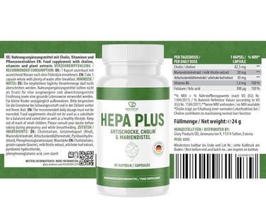 Hepa Plus Kapseln sind ein vegetarisches Nahrungsergänzungsmittel in praktischer Kapselform. Die Rezeptur basiert auf einer ausgewogenen Kombination aus hochwertigen Pflanzenextrakten und essenziellen Vitaminen sowie Cholin. Jede Kapsel ist klein, geschmacksneutral und leicht zu schlucken – ideal für den Alltag.